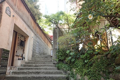 その銭湯の脇を上がるこの小路こそ“神楽坂インスタ映えスポット”の一つ、「熱海湯階段(別名 芸者小道)」です。